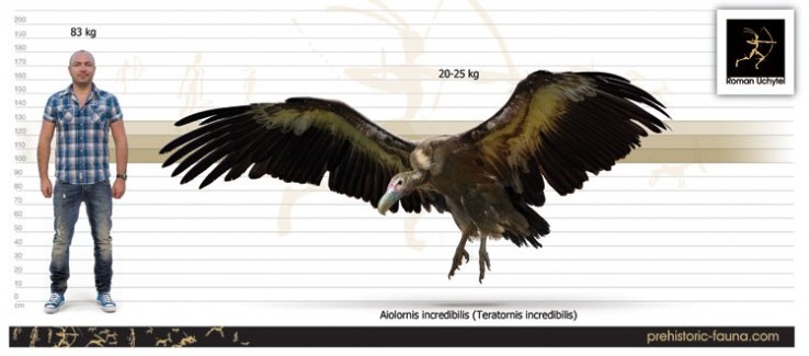 Aiolornis incredibilis (ранее Teratornis incredibilis) из семейства Teratornithidae был самой большой известной североамериканской летающей птицей с размахом крыльев около 5 м и огромным мощным клювом.