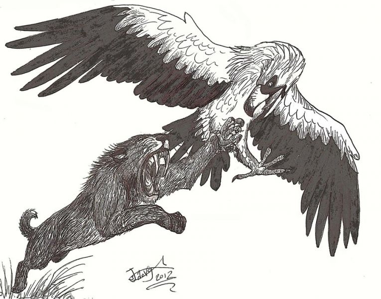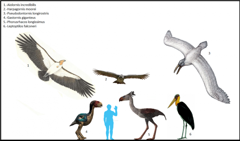 На рисунке ниже представлены Aiolornis incredibilis, Harpagornis moorei, Pseudodontornis longirostris, Gastornis giganteus, Phorusracos longissimus, Leptoptilos falconeri.