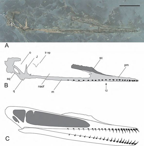 Череп легко построен и имеет длину 326 миллиметров. Он очень вытянут, имея в самой высокой точке всего 55 миллиметров в высоту, профиль его почти треугольный. Почти половина длины черепа приходится на большое отверстие, полученное в результате слияния ноздревого окна с предглазничным. В передней части черепа — низкая и удлиненная морда. Ростральный индекс Naish & Martill, а именно наибольшая длина, деленная на максимальную высоту, составляет 5,4. Это наибольшая величина известная для любого птерозавра. В рыле было около одиннадцати или двенадцати зубов, всего в верхней челюсти их было от двадцати пяти до тридцати. Размер зубов самый большой впереди и постепенно уменьшается по направлению к задней части черепа. Зубы имеют широкое основание с овальным поперечным сечением. Возможно, зубы направлены наружу, однако деформация черепа при сохранении ископаемого делает этот факт неопределенным.